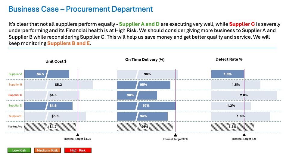 The Procurement Department of a mid-sized manufacturing company has recently expanded its supplier base. This expansion aims to improve cost competitiveness. It also ensures supply chain resilience. However, senior leadership is concerned about rising costs and inconsistent supplier performance. The department needs to present a concise analysis to leadership. This analysis must be data-driven. It should highlight key supplier issues. Additionally, it should recommend actionable next steps.