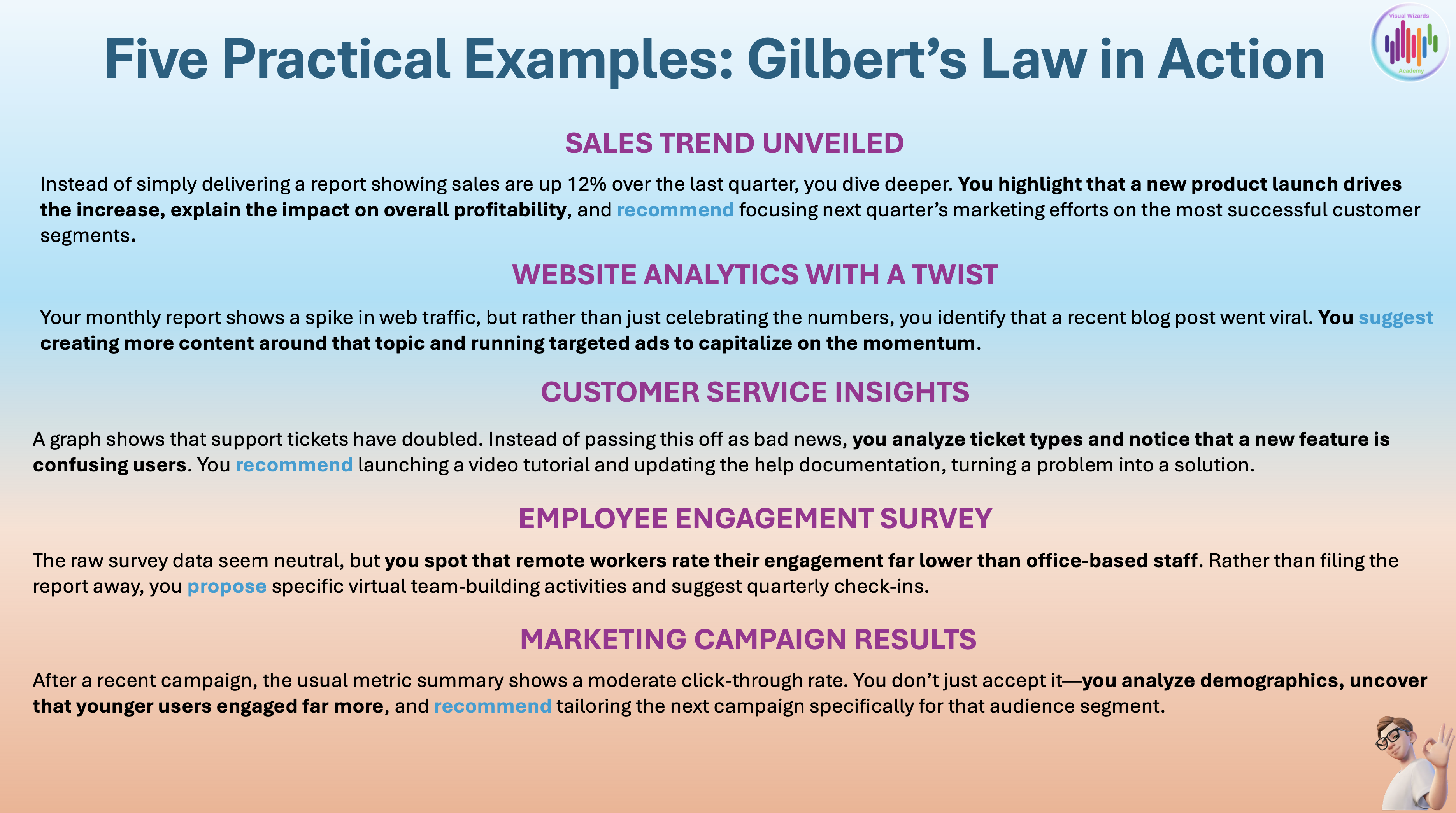 Let’s make this principle practical. Here are five everyday scenarios where Gilbert’s Law transforms data storytelling from passive reporting to real leadership. Read below and notice the blue-highlighted words. That’s where the power is.