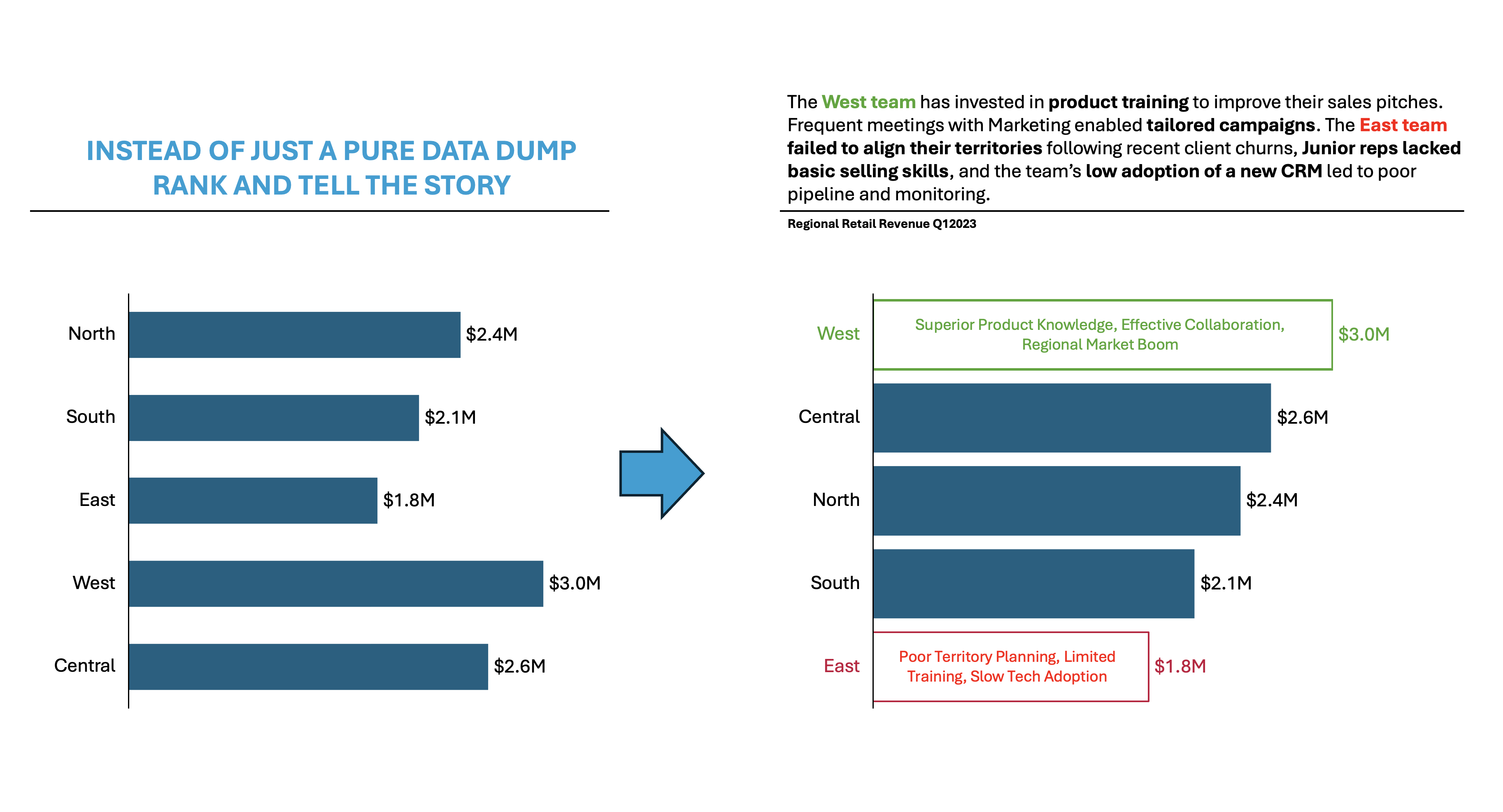 - Slow Adoption of Technology: East lagged in using new CRM tools, making pipeline management and reporting less effective.