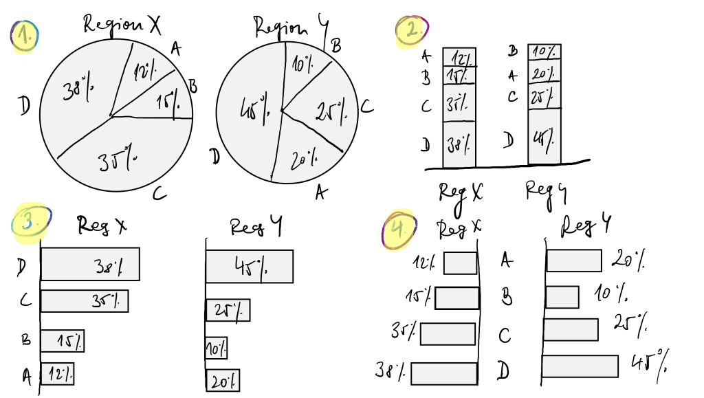 In Charts 1 and 2, you are showing/informing that each Region has a different Product Mix. In Chart 3, you rank the Mixes for Region X. At the same time, you mirror the same for Region Y. This clearly shows that Products C and D have the highest mixes in both. In Chart 4, you compare the product mixes for each region. Region Y has a higher Product Mix of D and A than Region X.